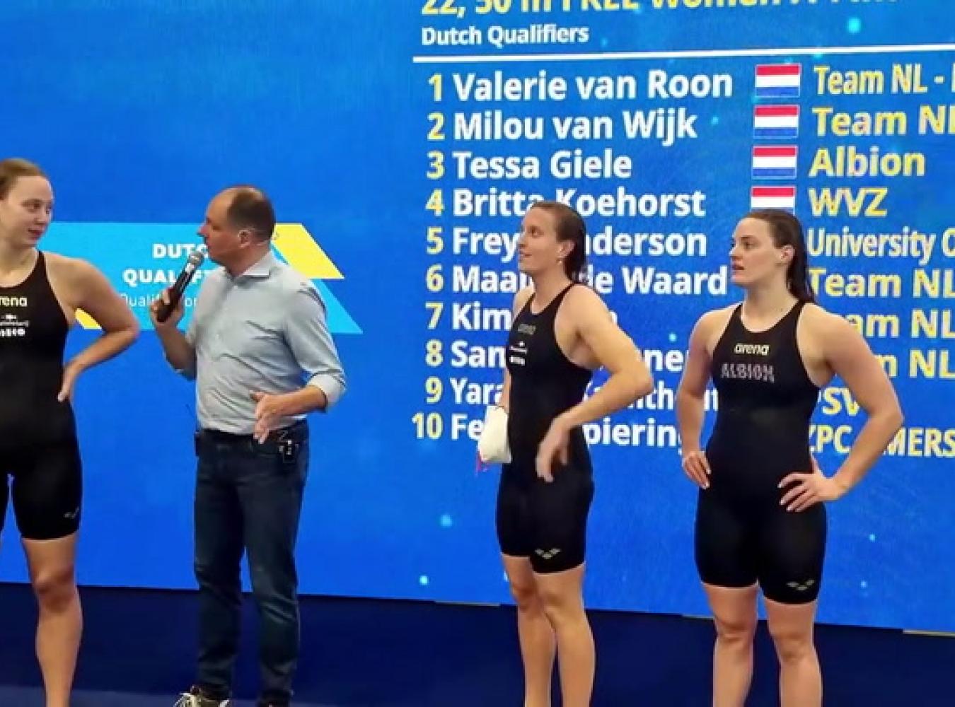 Milou van Wijk, Valerie van Roon en Tessa Giele na de 50 vrij